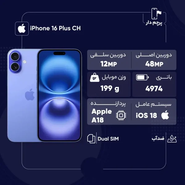 آیفون 16 پلاس انتخابی بی‌نظیر برای کاربرانی‌ست که به دنبال قدرت، زیبایی و لوکس بودن در یک گوشی هوشمند هستند. 16 پلاس را می‌توان نسخه اقتصادی آیفون 16 پرومکس و نسخه بزرگتر آیفون 16 معمولی دانست. این گوشی با نمایشگر 6.7 اینچی Super Retina XDR OLED و رزولوشن بالا، تجربه تماشای تصاویر و ویدیوها را به سطحی جدیدی ارتقا می‌دهد. از طرفی روشنایی 2000 نیتی و پشتیبانی از HDR10 و Dolby Vision، وضوح و دقت رنگ در تصاویر را بالا می‌برد. آیفون 16 پلاس به تراشه قدرتمند A18 اپل مجهز شده است که در کنار 8 گیگابایت رم، عملکردی سریع و روان را در تمامی شرایط تضمین می‌کند. دوربین دوگانه 48 مگاپیکسلی به همراه لرزشگیر اپتیکال تصویر و سنسور فوق عریض 12 مگاپیکسلی، عکاسی و فیلم‌برداری با کیفیت بالا را برای شما به ارمغان می‌آورد. این گوشی نه فقط در سایز بلکه در ظرفیت باتری هم بزرگتر از آیفون 16 معمولی است. باتری 4674 میلی‌آمپرساعتی و شارژ سریع 50 درصد در 30 دقیقه، نگرانی‌های شما را از تمام شدن باتری در روزهای پرمشغله‌تان برطرف می‌کند. علاوه بر این، آیفون 16 پلاس از شارژ بی‌سیم MagSafe نیز پشتیبانی می‌کند. اپل در طراحی این گوشی زیبایی و استحکام را با هم ترکیب کرده است و 16 Plus با بهره‌مندی از گواهی IP68 یک گوشی کاملا ضد آب محسوب می‌شود. این گوشی 199 گرم وزن دارد و متناسب با ابعادش، یک گوشی نسبتا سبک محسوب می‌شود. در مجموع آیفون 16 پلاس یکی از بهترین گزینه‌ها برای طرفدارانی‌ست که به گوشی‌های اپل علاقه‌مند هستند و به صفحه نمایش بزرگ و قیمت مناسب توامان اهمیت می‌دهند.